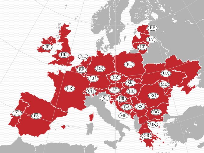 Andorra*, Austria, Belgio, Bosnia, Bulgaria, Canarie, Ceuta*, Croazia, Estonia, Francia, Germania, Gran Bretagna, Grecia, Irlanda, Lettonia, Lituania, Lussemburgo, Macedonia, Melilla*, Moldavia, Montenegro, Olanda, Polonia, Portogallo, Repubblica Ceca, Romania, Serbia, Slovacchia, Slovenia, Spagna, Svizzera, Ucraina, Ungheria